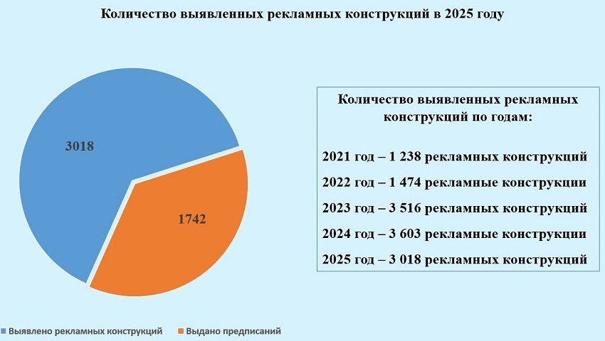По данным комитета, в прошлом году на территории областного центра выявили 3 018 рекламных конструкций, не имеющих разрешительной документации. На демонтаж было выдано 1 742 предписания. Из общего количества выявленных за 12 месяцев 2025 года рекламных конструкций 1 848 единиц демонтировали собственники добровольно, ещё 212 конструкций ликвидировала подрядная организация. По 291 рекламной конструкции работа будет продолжена в 2026 году. На оплату услуг подрядных организаций, выполнявших работы по сносу незаконных рекламных конструкций, израсходовано 757 тыс. рублей. Кроме того, за 2025 год комитетом было предъявлено 73 претензии на сумму свыше 556 тыс. рублей. Из них оплачено (возвращено в бюджет) чуть более 385 тыс. рублей — по 52 претензиям. В бюджете на 2026 год на демонтаж рекламных конструкций запланирована сумма в размере 999 тыс. рублей. Подписывайтесь на нашу страницу новостей "НИА-КАЛИНИНГРАД" в telegram.
